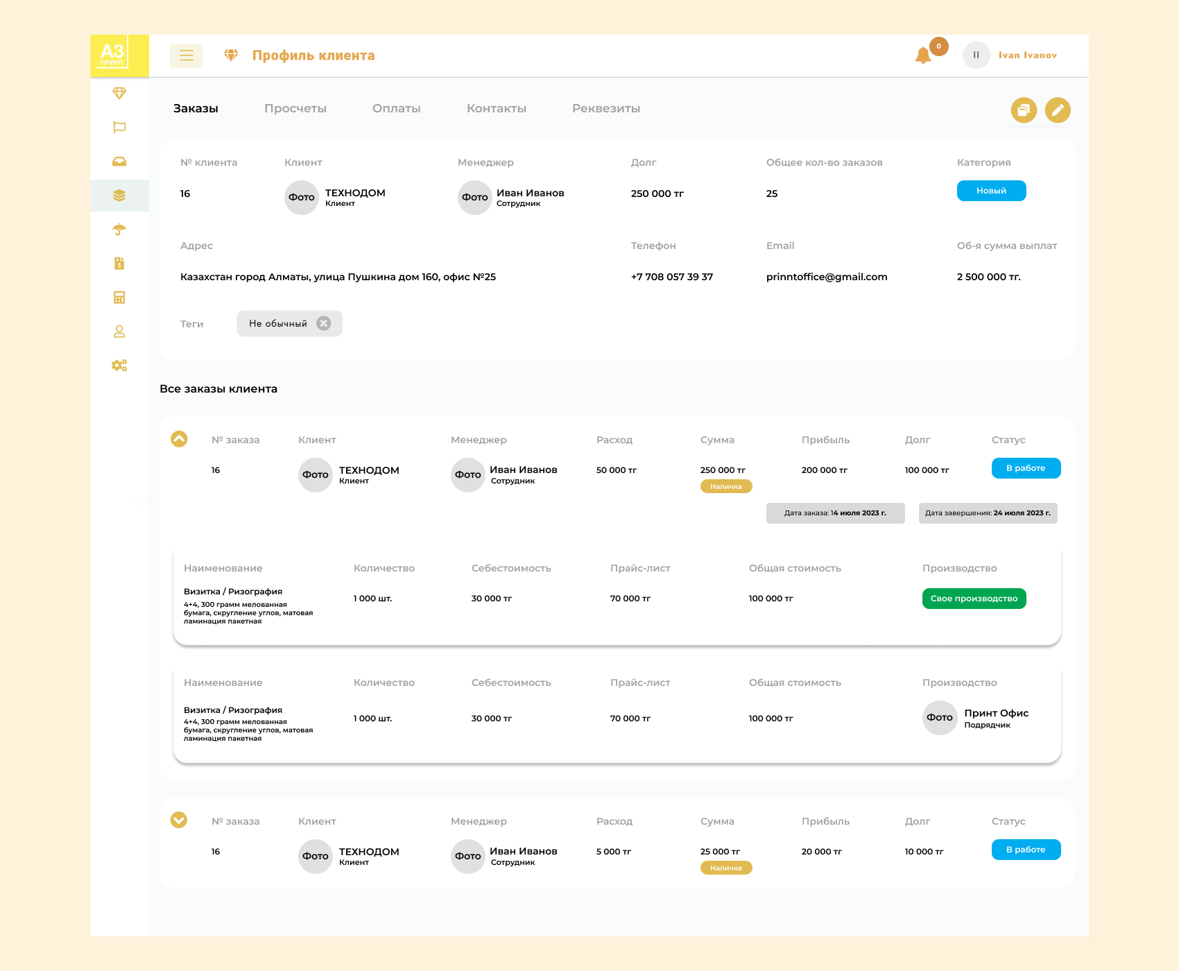 Мы проанализировали все этапы работы компании, и разработали удобную систему, тем самым улучшили эффективность и сэкономили ресурсы компании внедрив корпоративную систему, а именно переназначение и работа с подрядчиками, отчеты и кассовый оборот компании, введение клиентов и его заказов, распределние работы внутри производства